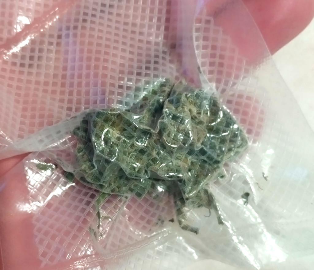 Сама шишка очень плотная, мясистая, липкая, очень твердая, отламывается большими кусками. Настолько, что из зипа доставалась с неохотой, а из вакуума — вообще будто не хотела выходить, пришлось все разрывать полностью. Руками разрывать сложно — только гриндер или кофемолка. На перебивке запах усилился в разы: кухня наполнилась тяжёлым сладко-фруктовым ароматом с хвойным, цветочным и землисто-гашишным фоном.